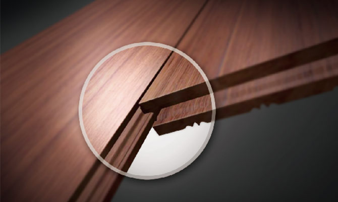 雙鎖扣技術(shù),柏爾獨(dú)創(chuàng)的雙鎖扣工藝技術(shù),沿襲中華千年木藝文化“榫卯”為原型,科技創(chuàng)新,鎖扣連接使地板連片成體,整體平移,免釘、免膠、免龍骨安裝,環(huán)保清潔,干凈衛(wèi)生。